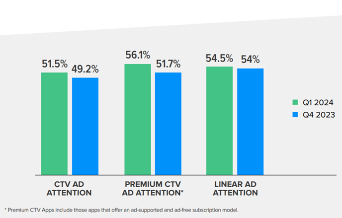 Aktuálnejšia štúdia od TVision a Double Verify z Q1 2024 porovnala Ad Attention v CTV inventory, Premium CTV inventory (aplikácie, ktoré ponúkajú model predplatného podporovaný reklamami aj bez reklám) a na lineárnej TV v USA. Zistili, že rozdiel medzi CTV a klasickou TV je minimálny, konkrétne 51,5% oproti 54,5%. Premium CTV s 56,1% už dokonca lineárnu TV prekonáva. Navyše kvalita CTV medziročne rástla a to je ďalší argument v prospech CTV plánovania.