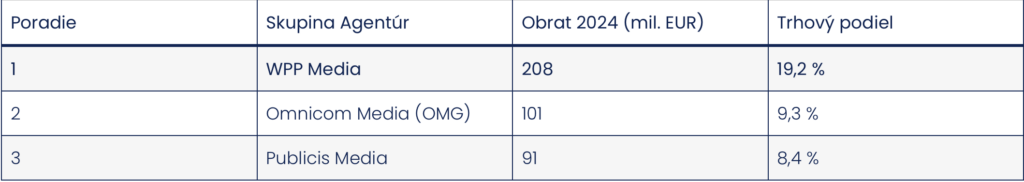 Z pohľadu skupín mediálnych agentúr je na prvom mieste za rok 2024 WPP Media, ktorá realizovala celkový obrat 208 miliónov EUR, čo predstavuje solídny medziročný rast o 8,1 %. WPP Media je na slovenskom trhu jednoznačne najlepšia vo viacerých kľúčových metrikách: